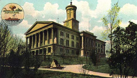 The image at the top of the page is a detail from a woodblock print of the Parthenon by renowned Nashville artist Ernest A. Pickup, 1887-1970. (Used by permission of the family.) The postcard photo of the Tennessee Capitol is from the NHN collection.